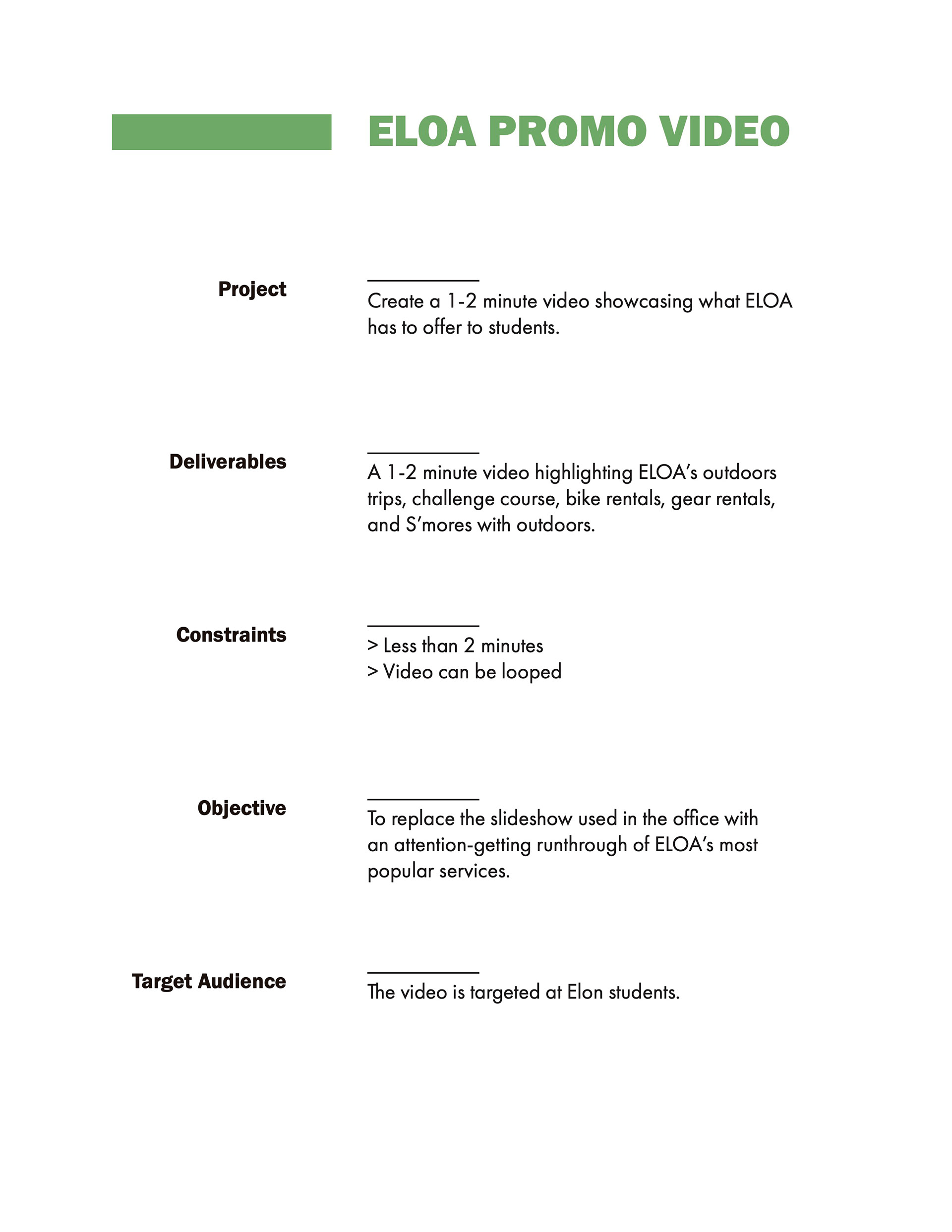 This promotional video was created for Elon University’s Experiential Learning and Outdoor Adventures (ELOA) program which offers various outdoor activities free of charge to students. Footage was filmed in partnership with the University Communications department. The goal of the video was to highlight what ELOA has to offer and inspire students to engage with the organization and sign up for programming. The video currently plays in the ELOA office.